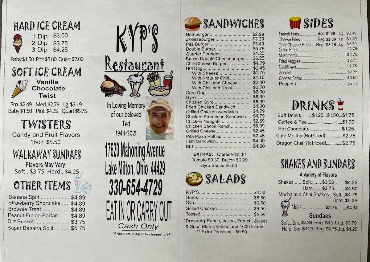 Welcome to Kyps Restaurant, a cherished gem nestled in Lake Milton, Ohio. With its warm, small-town diner atmosphere, Kyps has become a beloved pit stop for locals and visitors alike. This family-owned establishment boasts a menu designed to delight every palate at an exceptional value.